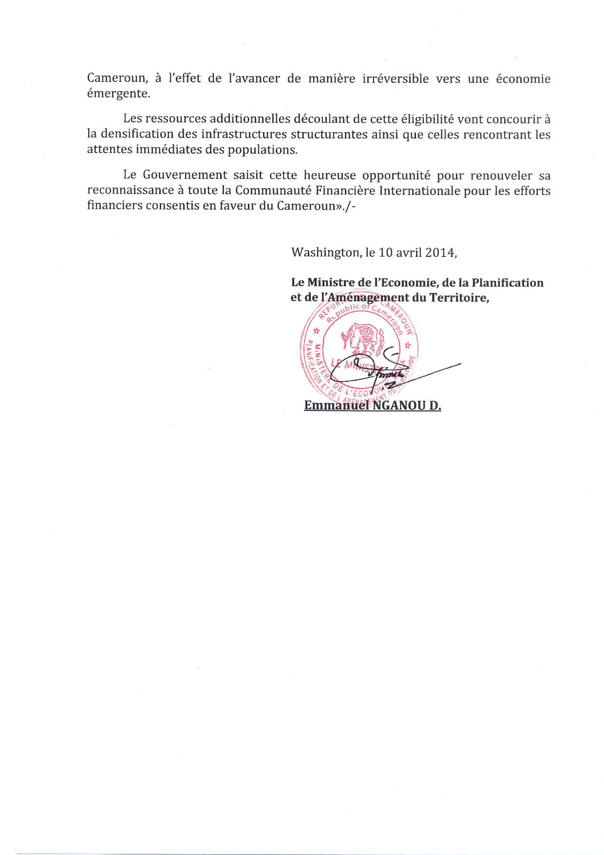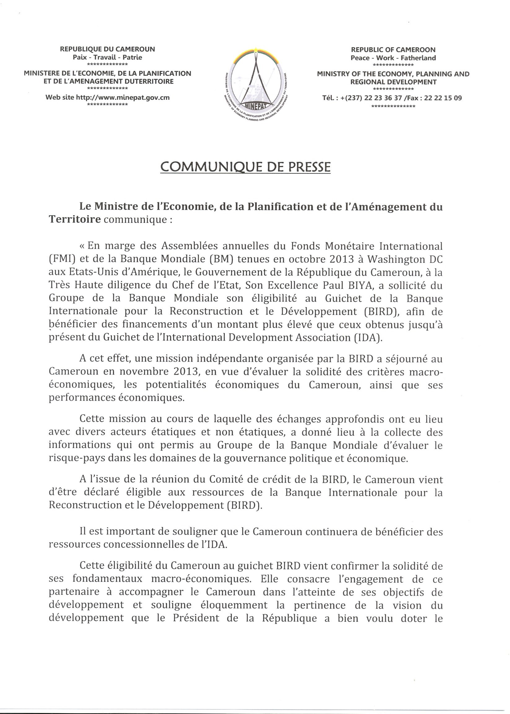 C’est la teneur du communiqué du le Ministre de l’Economie de la Planification et de l’Aménagement du Territoire (MINEPAT) Camerounais rendu public le 10 Avril 2014 depuis Washington. En effet, depuis plus d’un an, l’Etat camerounais est en négociation avec les institutions de la Banque mondiale pour évaluer les capacités du pays à accéder à ce programme de financement. La décision prise est selon le communiqué du ministre le fruit d’un processus qui a débuté en Octobre 2013. C’est à cette période que le gouvernement camerounais sollicite son éligibilité au guichet de la Banque Internationale pour la Reconstruction et le Développement (BIRD) à l’occasion des assemblées annuelles du FMI et de la BM à Washington. Cette éligibilité est sollicitée pour bénéficier des financements d’un « montant plus élevé que ceux obtenus jusque-là des guichets de l’ l’International Development Association (IDA) ».